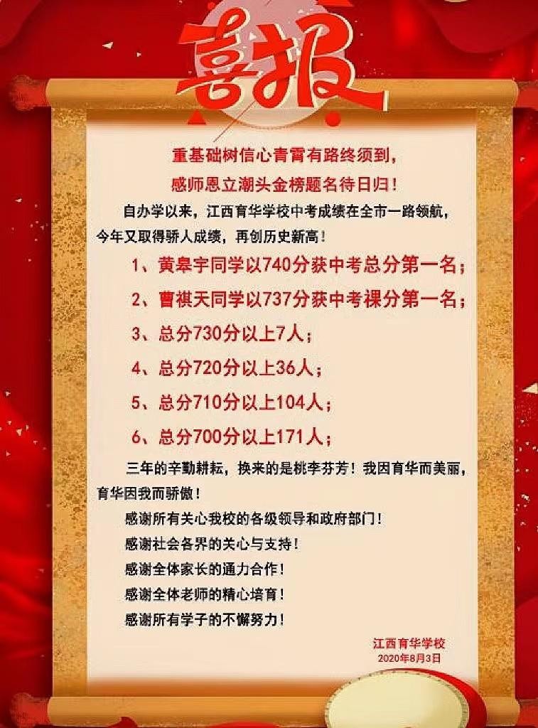 昨晚,育华学校正式发布公告停办民办育华中学,这所曾经笑傲洪城的民办中学在2020年喜报中这样写道:在办学以来,中考成绩在全市一路领航,2020再创历史新高。不仅培养出了总分第一和裸分第一,全校700分以上高达171人。