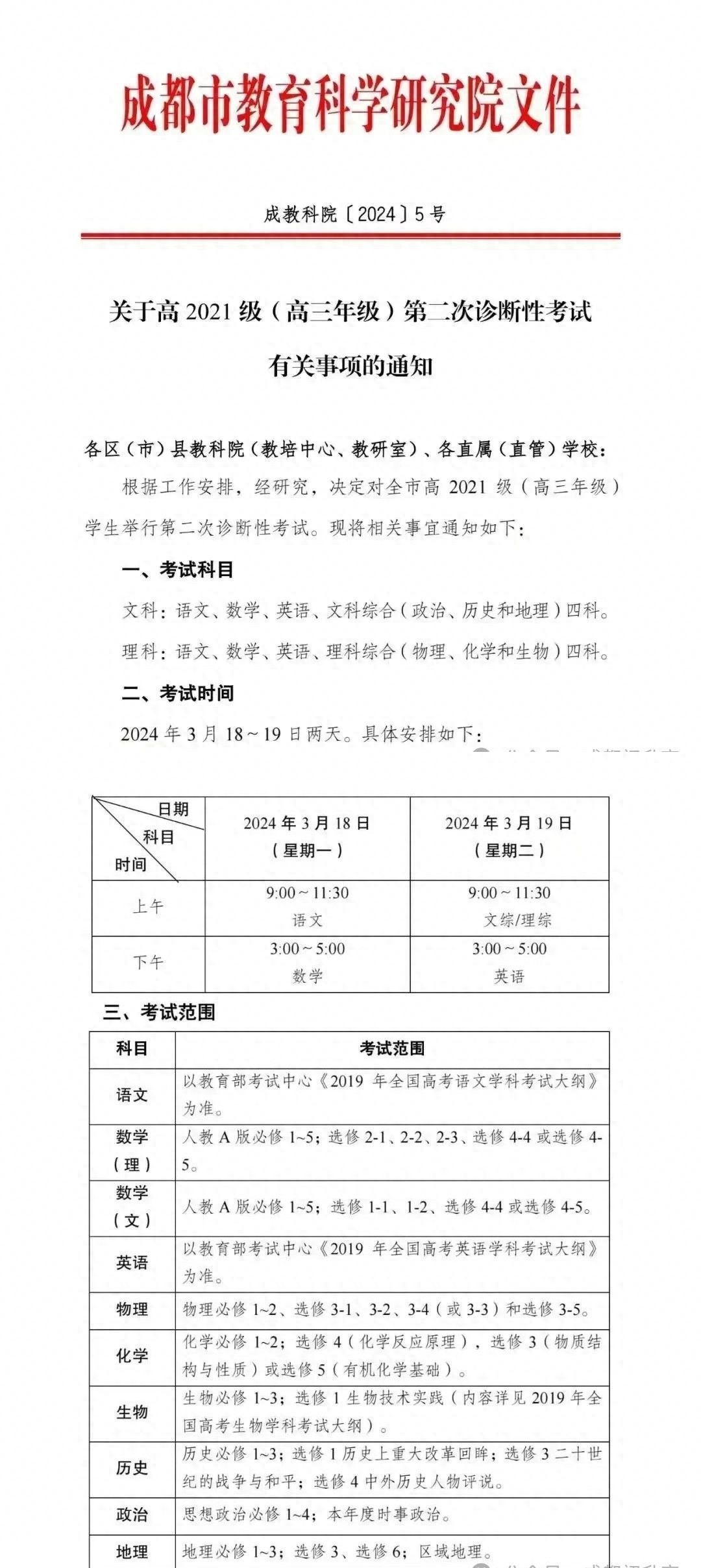 据家长分享,成都市2021级(高三年级)二诊考试将于3月18-19日进行。