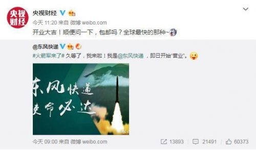 刚刚,中国人民解放军火箭军官方微博@东风快递 发布了第一条消息:#火箭军来了#久等了,我来啦!我是@东风快递,即日开始“营业”。