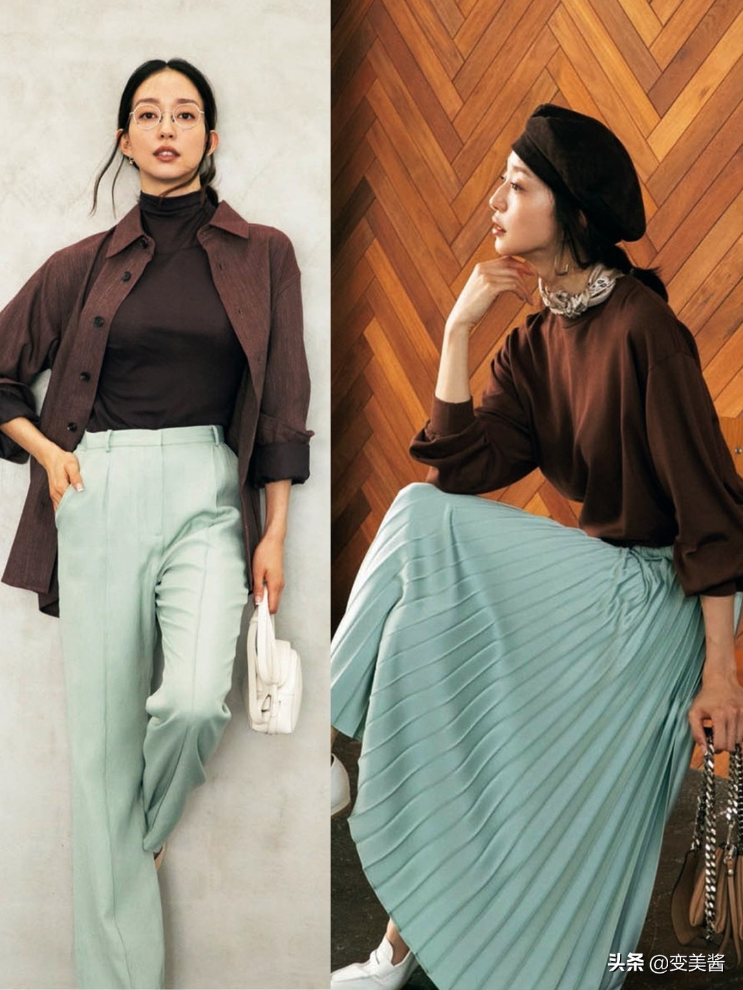 不得不说,焦糖色与薄荷绿的配色组合也太好看吧,高级又洋气!让我们再来看看这组穿搭,在左图的搭配中,上身选择了一款焦糖色的基础款衬衫,内搭同色系的高领打底衫,随性休闲又不失沉稳气质,下身再搭配一条薄荷绿色的高腰西装裤,平添几分清爽气质感觉。右图穿搭中,身穿一件焦糖色的针织衫,知性且温柔,脖颈处系上一条印花丝巾,更显得精致优雅。下身再搭配一条薄荷绿色的百褶半身裙,轻盈而飘逸,浪漫而又迷人!
