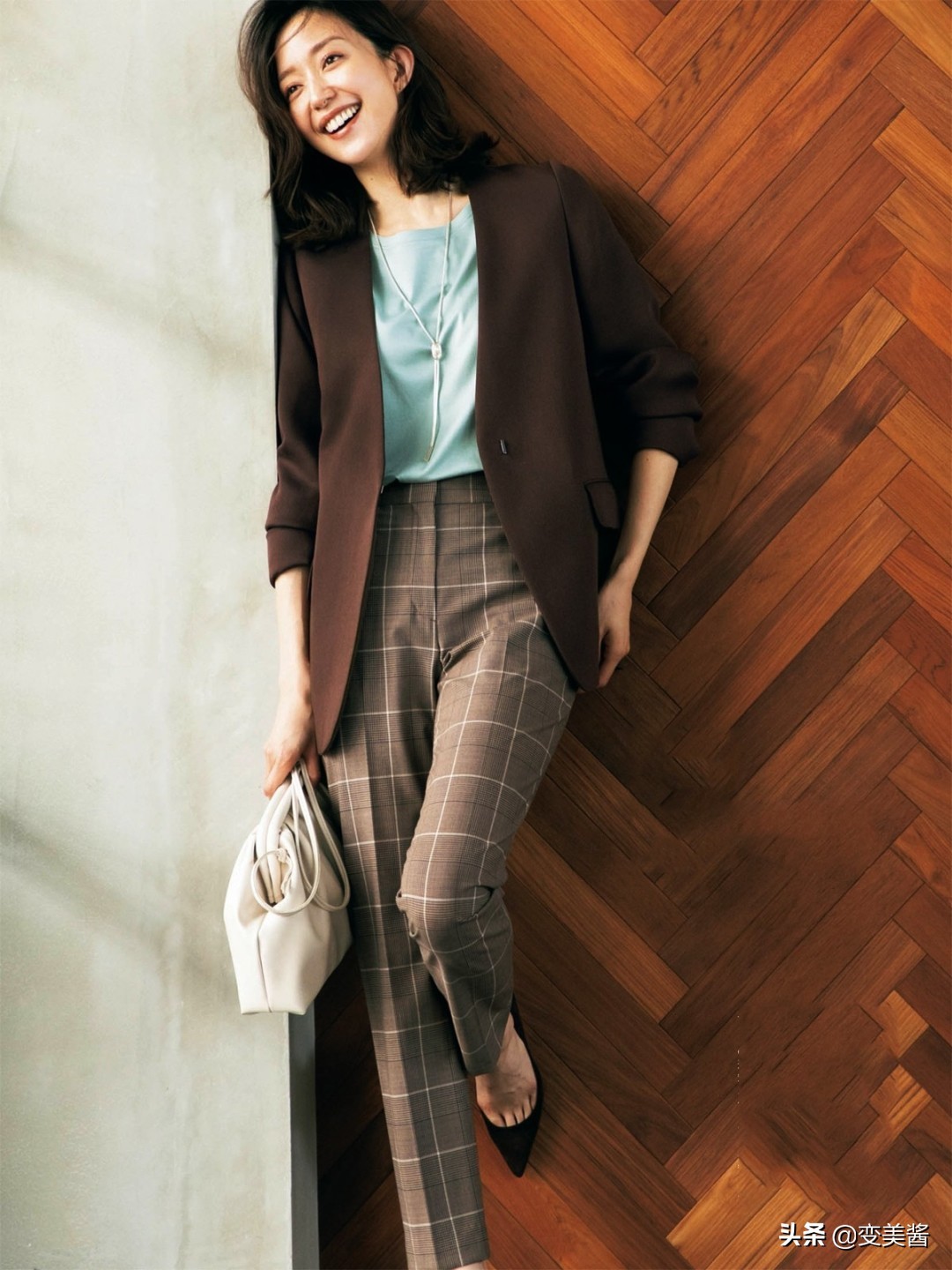 可能在不少人的眼中,焦糖色还是会显得有些许暗沉了,尤其对于年轻的女性而言。所以,这时候我们就可以选择一些比较清爽亮眼的色系来进行搭配,薄荷绿就是很不错的选择。薄荷绿这个颜色看起来特别清爽,能够提到很不错的提亮效果。选择一件焦糖色的基础款西装外套内搭一件薄荷绿色的雪纺打底衫,轻松打破暗色带来的沉闷厚重感,既显得知性沉稳又显得清爽醒目。下身搭配一条焦糖色的格纹西装裤,整体看起来协调又显气质,同时也能够制造看点。