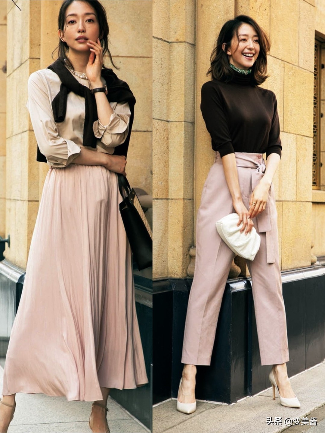 对于成熟的女性而言,是不是对粉色系又爱又恨呢?粉色穿起来虽然说特别衬肤色特别减龄,很有少女感,但是年纪大了,穿粉色是不是存在装嫩的嫌疑呢?所以年纪大了穿粉色,一定要选择比较沉稳的颜色来压制住它,这样才能够将粉色的优势穿出来,又不会有装嫩的嫌疑。选择一件杏色的基础款衬衫搭配一条浅粉色的百褶半身长裙,清新而又温柔,再系上一条焦糖色披肩,整体又多了几分沉稳的感觉。焦糖色的针织打底衫搭配一条印花丝巾,显得知性而又优雅,再搭配一条浅粉色的九分西装裤,清爽而又气质。