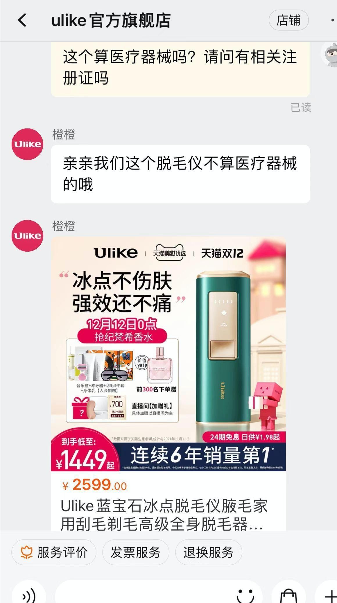 在小编询问客服产品是否具备医疗器械相关证明时,客服表示,店内脱毛仪产品不属于医疗器械,无法提供相关医疗器械证明。就这个问题,小编也联系了Ulike品牌方,但截至发稿,未收到回复。
