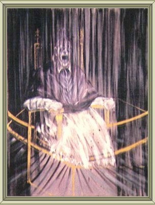 背景:《教呈英诺林十世肖像的习作》是20世纪最有影响力的艺术家之一弗兰西斯·培根的作品。画中坐在金交椅上的教皇似乎很孤寂,为了发泄,他正伸直脖子,张着大嘴大声尖叫。培根通过流动的油画笔触,即添上瀑布流水似的屏幕来展现教皇的情感,这种粗犷的处理方式令观者困惑和不安。