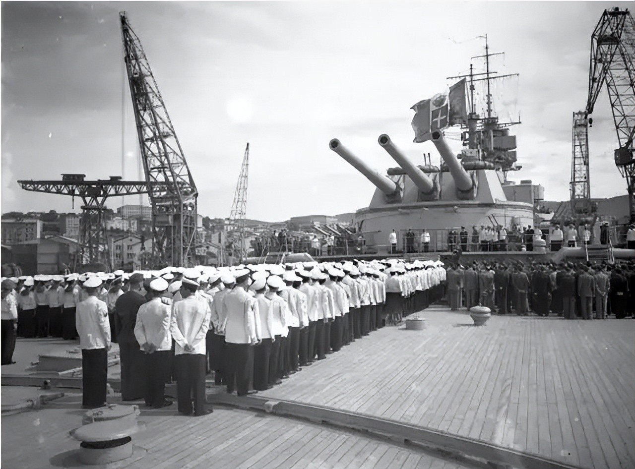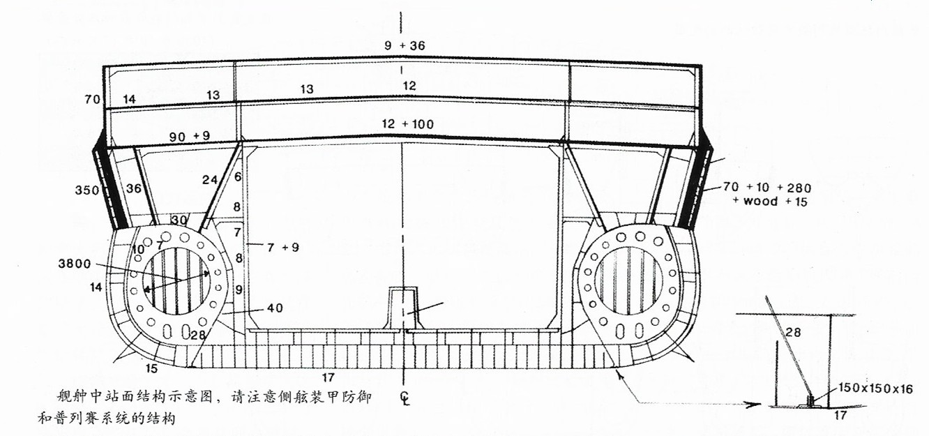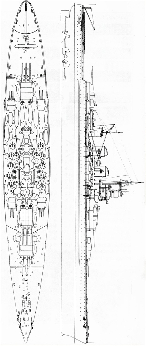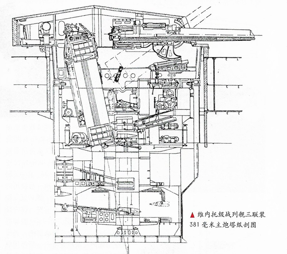 三联装主炮塔重1595吨,比当时一些驱逐舰都重。副炮为4座三联装的152mm炮塔。