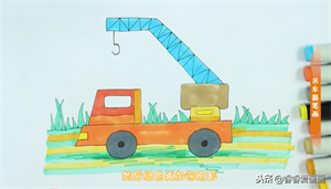 5、最后再使用橙色和红色涂在车身上,然后轮胎可以选择灰色和黑色,吊臂使用蓝色,然后小草即为绿色,地面则使用绿色和黄色涂出条纹形状。