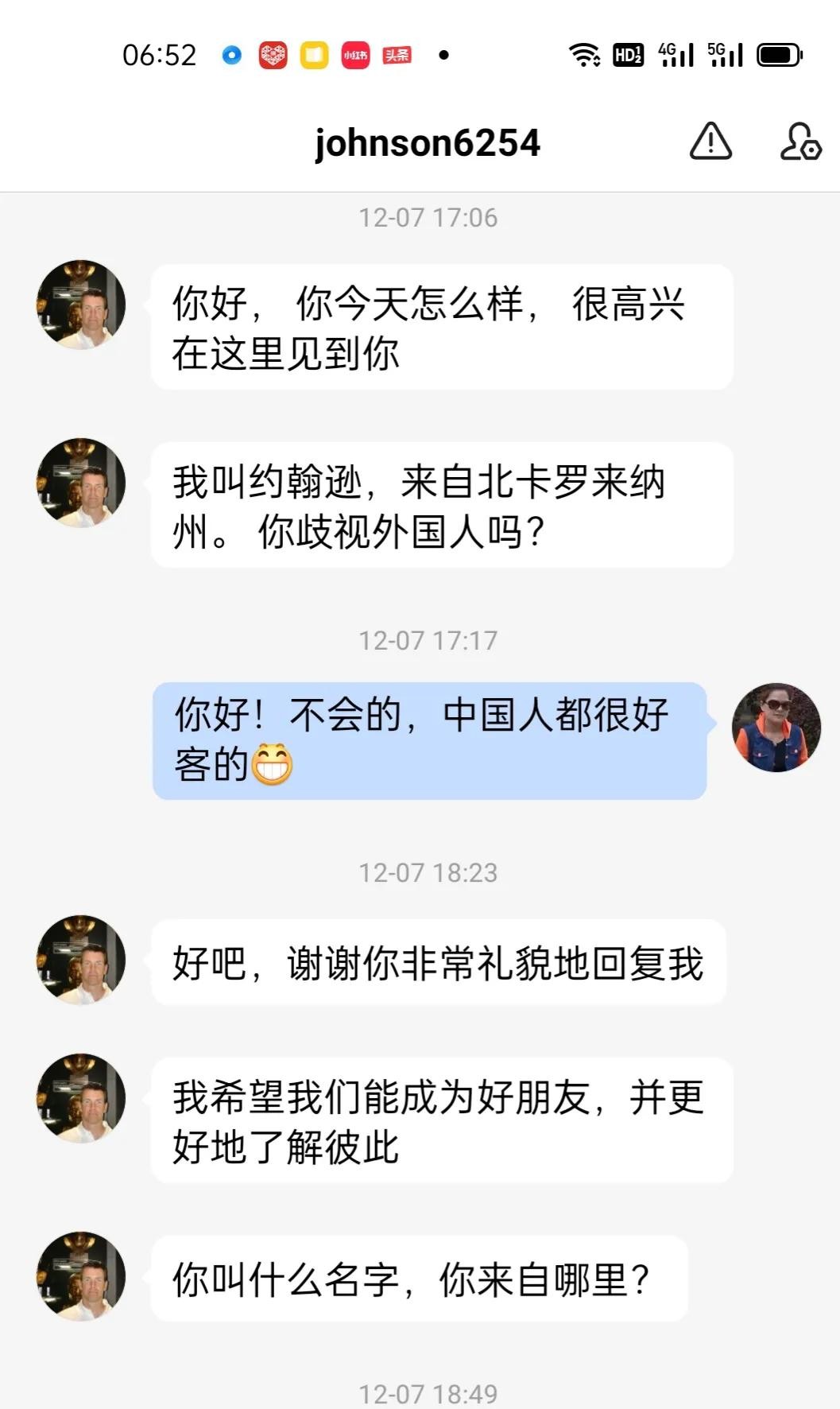 而且凑巧的是遇到两个美国人,第一个遇到的是我入头条三天,一个名叫艾伦的告诉我他还向往中国,当时我只是单纯的想给他介绍中国的风土人情,而他给我说的是丧偶了,有一个三岁的女儿(当时分享了他和女儿的视频),在美国有自己的工厂……,大概聊了一周左右他说手机掉到水里了,刚去买的新的,要我重新加他的微信号,又过了几天他的微信又用不了,让我给他注册微信号?中国人都知道一个微信号就算手机坏了微信号都不会丢的,而他三番五次的更换微信号