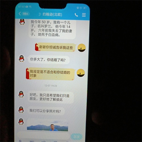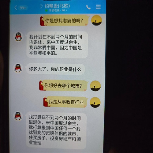 说他会使用QQ,我们就加了QQ在聊,我想声明的是我不是单身女人,之所以会加他聊是想看看这些人到底要演哪出戏?接着他一上线就给我介绍他的情况,