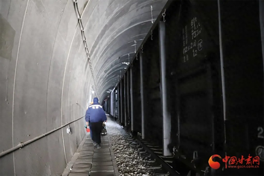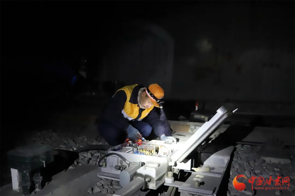 近日,嘉峪关电务段阿克塞信号车间阿克塞检修工区利用“天窗”对当金山隧道内道岔进行日常养护、检查调整。