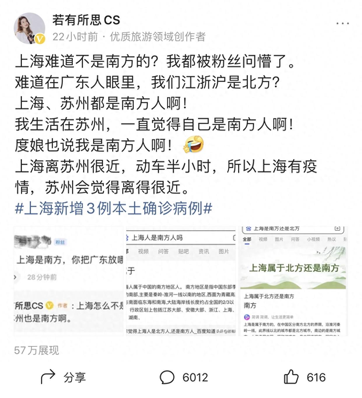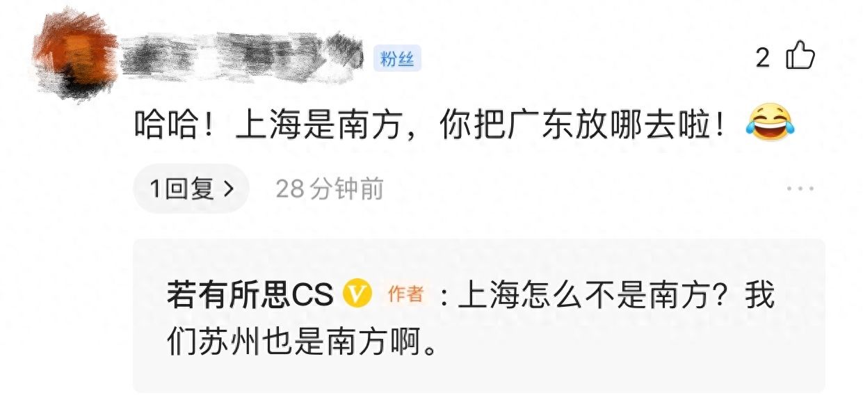 谁知一个粉丝回复我:上海是南方,你把广东放哪去啦!