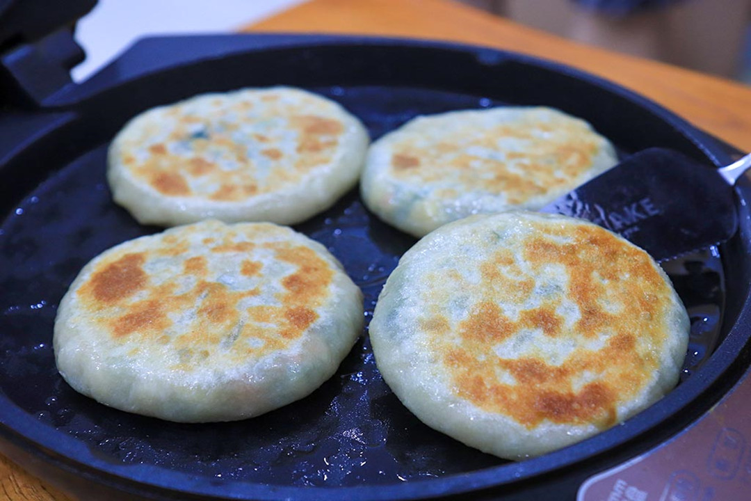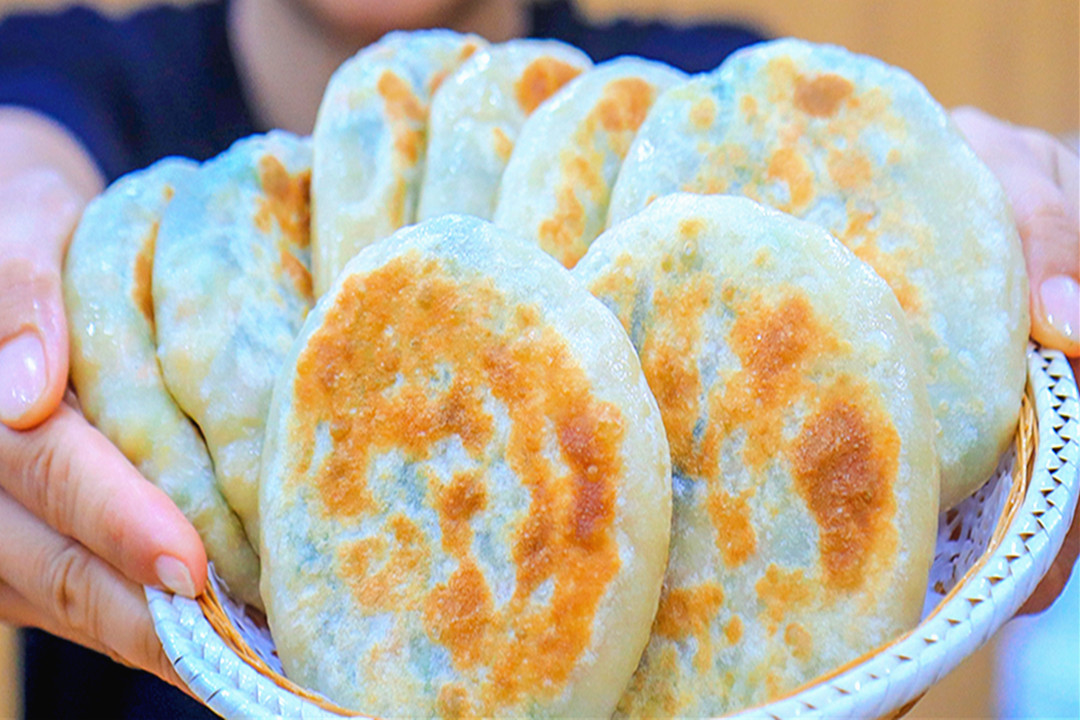 6.来回翻过两次,饼鼓起来里面的馅就熟了,因为饼非常薄,烙个两分钟基本就熟了,饼皮酥香、内陷鲜香,趁热吃口感最好。