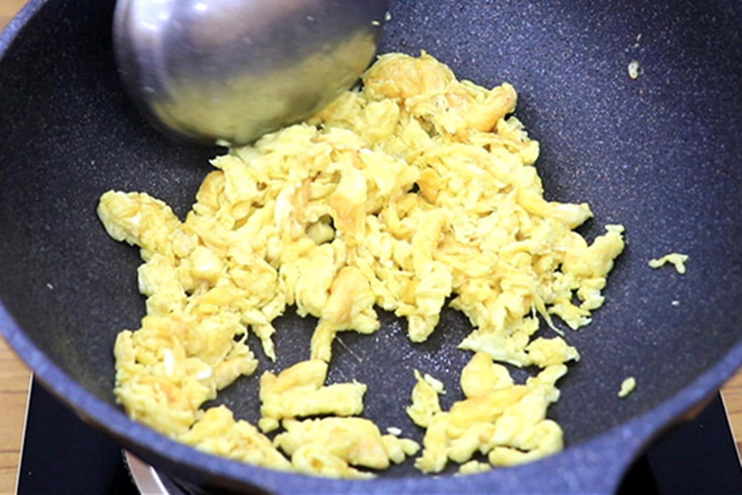 2.碗中打入四个鸡蛋,加入少许食盐,用筷子快速把鸡蛋搅散。锅烧热,加入适量的植物油,把蛋液倒进去,快速炒散、炒熟,然后倒在案板上切成鸡蛋碎。