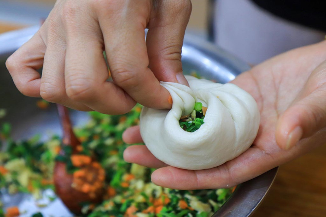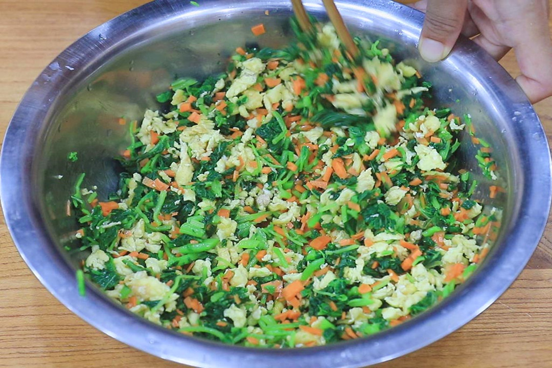 3.准备一把苋菜,用清水清洗干净控干水分,放在沸腾的水中焯一下,变软以后捞出来、过一下凉水。然后把把苋菜挤干水分切成小段,胡萝卜半根、切成胡萝卜粒,和苋菜放在一起,再倒入鸡蛋碎,加入蚝油3克、芝麻香油5克、鸡粉1克、食盐1克搅拌均匀,馅料就调好了。
