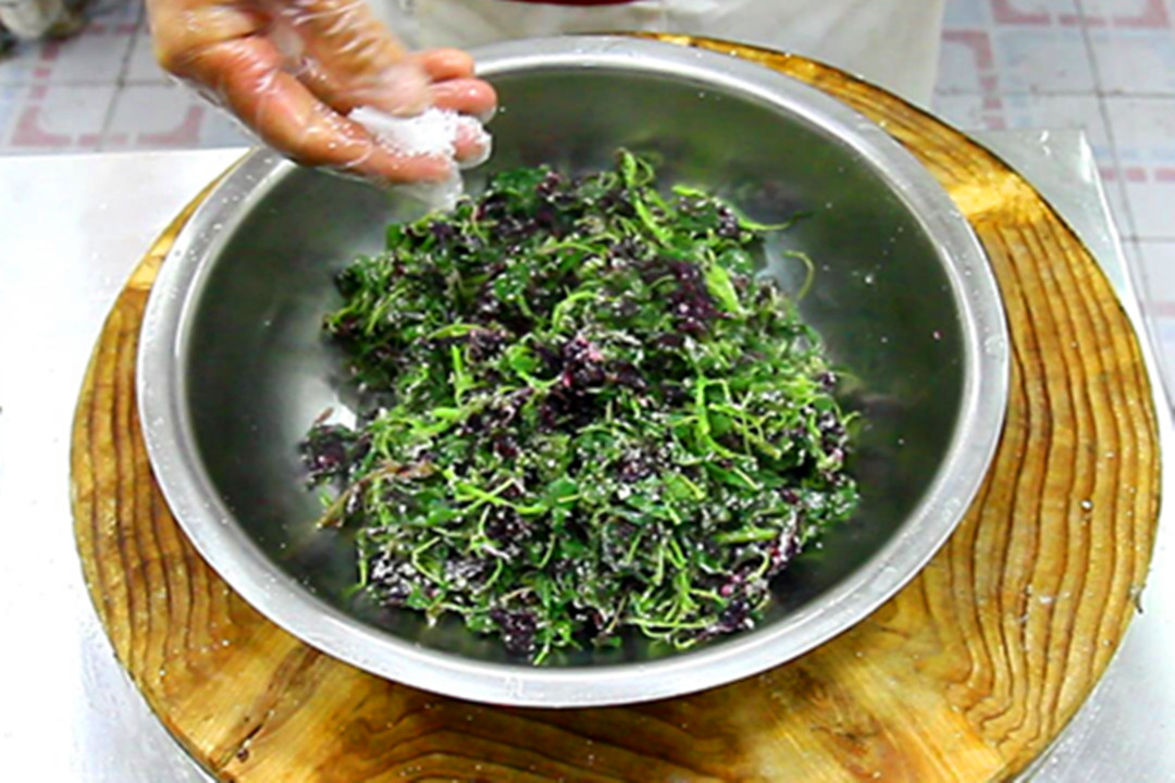 2.然后把控干水分的苋菜放在盆里,加入适量的植物油拌匀,植物油能够锁住苋菜中的水分,防止蒸的时候出水;再撒入适量的面粉,搅拌到看不到绿叶为止,不能太厚、不然蒸出来容易粘连。