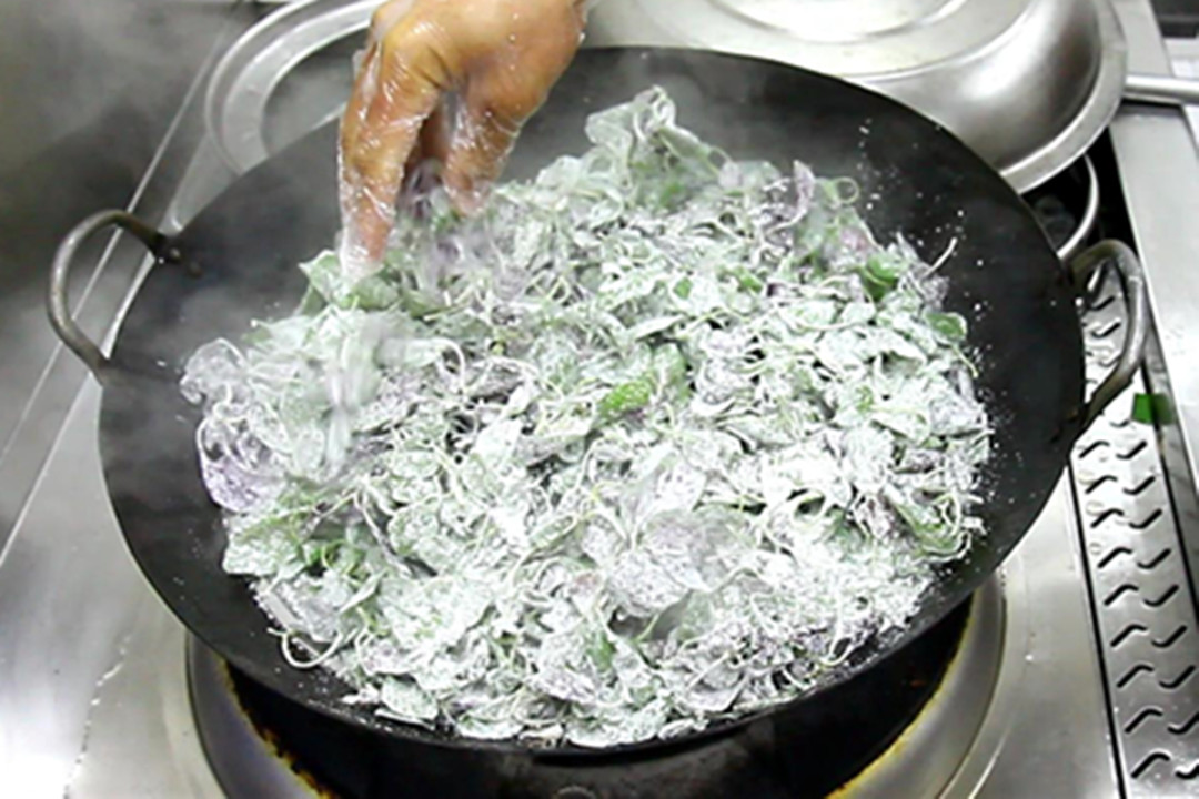 4.三分钟以后把苋菜倒出来并快速抖散,凉了就粘在一起了,抖散以后趁着余温撒上食盐,喜欢原味的就可以开吃了。