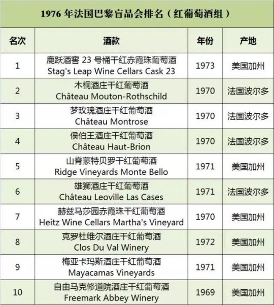 2、白葡萄酒组据悉,当时盲品会从白葡萄酒开始,6 款加州霞多丽和 4 款勃艮第霞多丽大 PK,最后,加州的蒙特莱那酒庄霞多丽干白(Chateau Montelena)完胜!而前 4 名中仅有一款来自勃艮第,具体结果如下图。