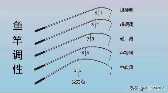 专业解释:水平挂 0.1kg 重物,竿身弯曲点的位置比例。比如 19 调竿,竿稍 10% 弯曲,剩下 90% 硬得像钢筋;46 调竿则是前 40% 弯曲,后 60% 弹性十足。