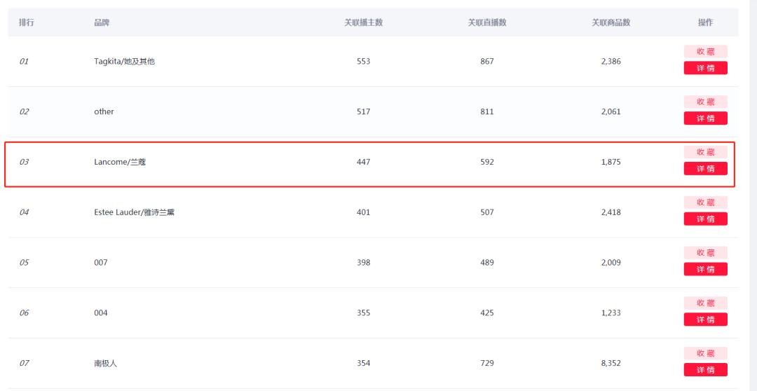 根据灰豚数据—品牌排行榜显示,在前十名中,美妆类品牌占比达到了50%,其中Lancome/兰蔻以592场关联直播、447位关联播主以及1875件关联商品位列品牌排行榜第三。