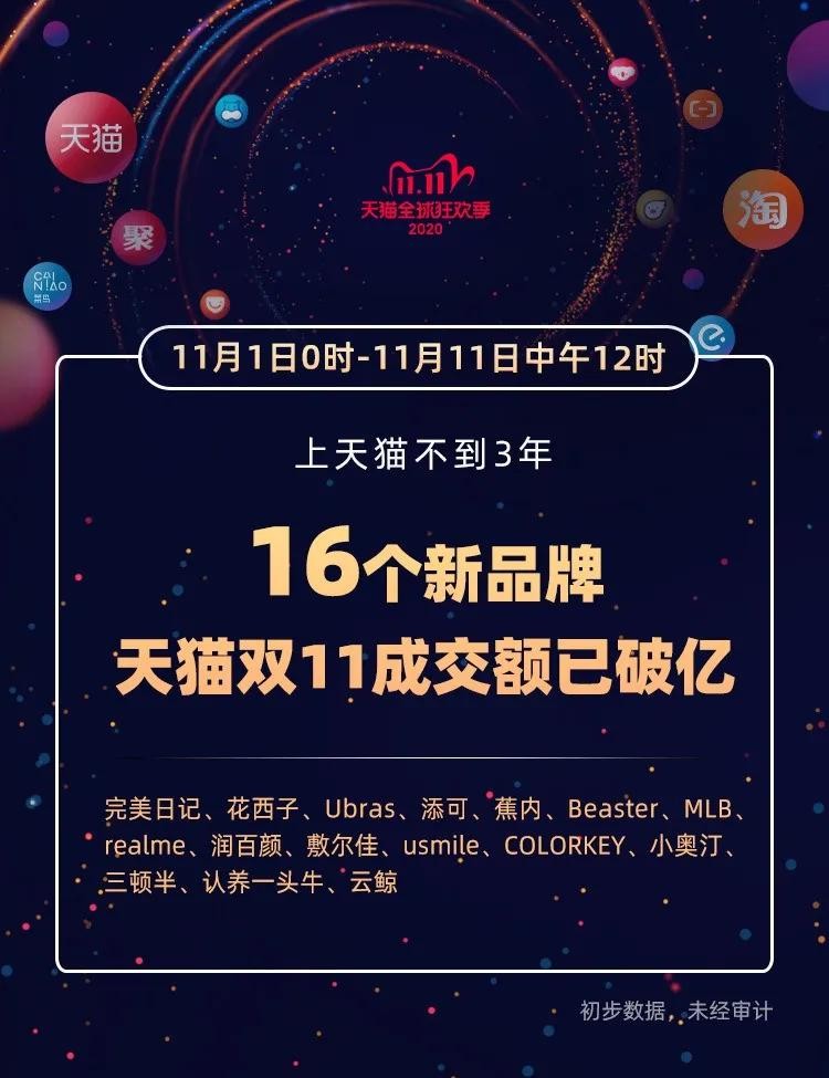 根据淘宝官方显示,11月1日至11月11日中午12点,16个新品牌在天猫双11累计成交额已突破1亿元,分别为完美日记、花西子、Ubras、添可、蕉内、Beaster、MLB、realme、润百颜、敷尔佳、usmile、colorkey、小奥汀、三顿半、认养一头牛、云鲸。