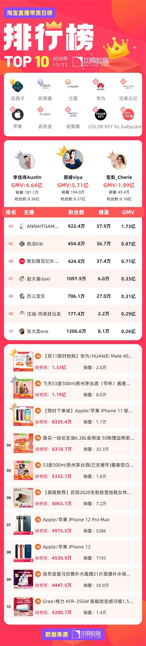说到主播,总少不了薇娅和李佳琦,根据灰豚数据显示,在11月10日与11月11日,薇娅直播间GMV累计超过17亿,带货销量超600万。李佳琦直播间GMV超11亿,带货销量也超过400万。