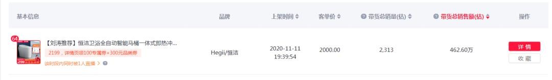 其中,GMV最好的商品为【恒洁卫浴全自动智能马桶一体式即热烘干冲洗多功能全自动家用】,达462.6万,共卖出2313件。