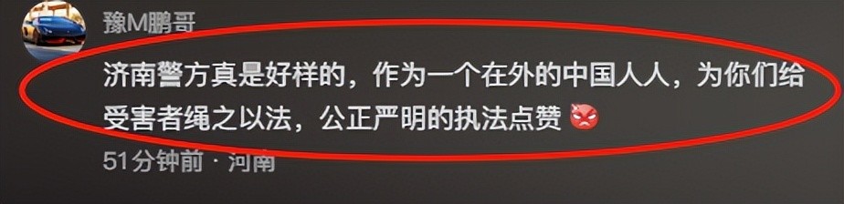“济南警方真是好样的,作为一个在外的中国人人,为你们给受害者绳之以法,公正严明的执法点赞’