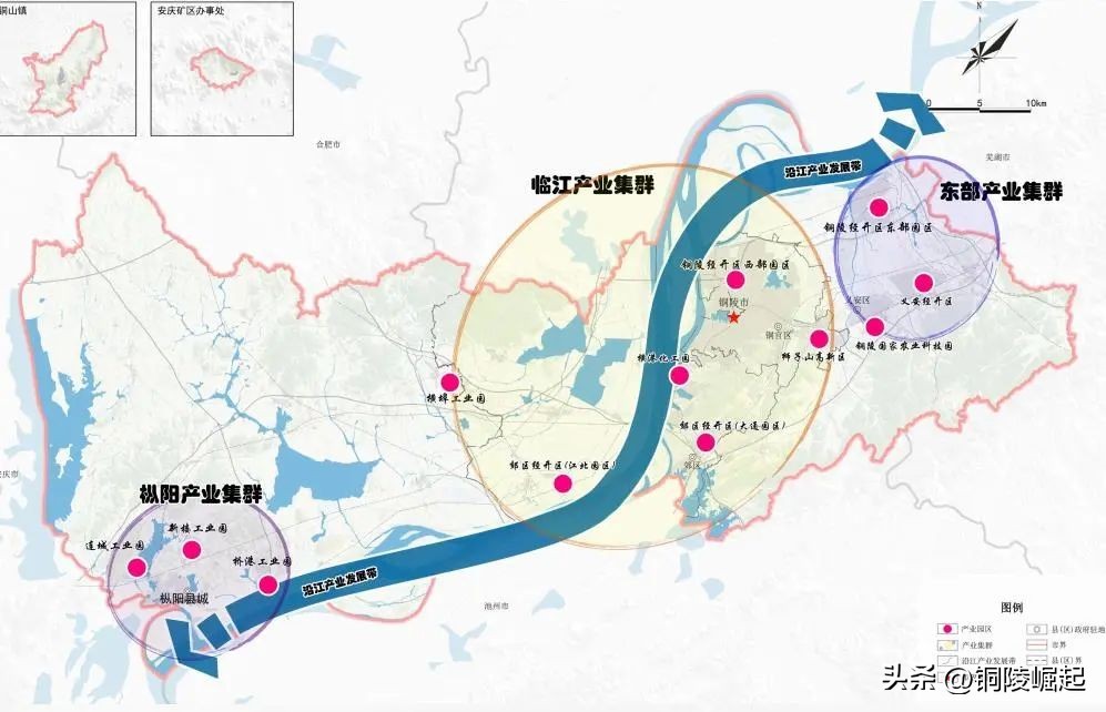 保障产业发展空间:依托长江综合交通走廊打造沿江产业发展带,形成东部、临江和枞阳三大产业集群,重点保障2个国家级开发区,1个国家级现代农业产业园,3个省级经济开发区和铜陵横港化工园区空间需求,构建“一带三群多园”集聚高效的产业发展平台。