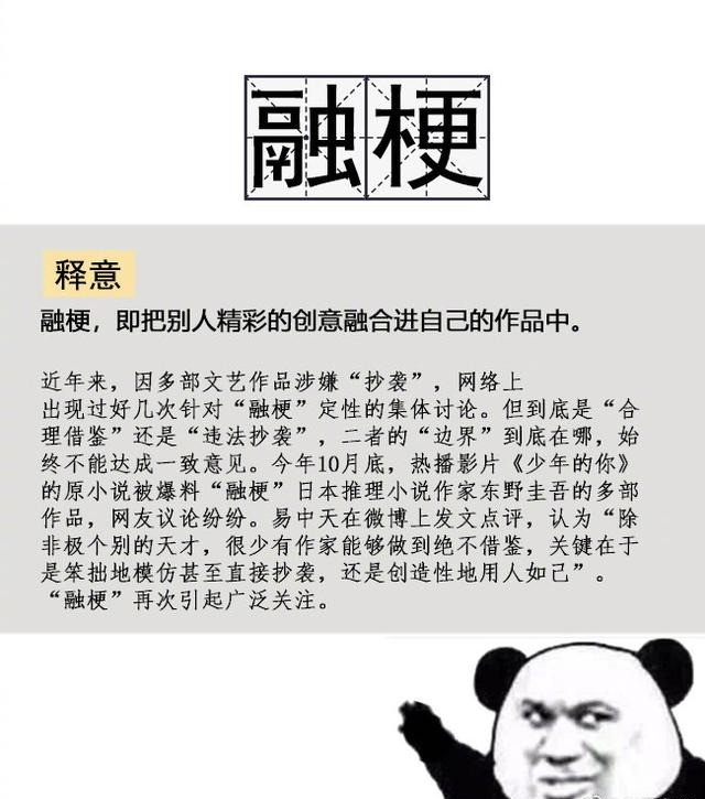 其实也就是指借鉴,到底是借鉴还是抄袭,这是一个非常难以界定的话题,由此就诞生了“融梗”。互联网的便利导致了“融梗”,但我们依然应该鼓励原创精神,而不是拿着“融梗”做挡箭牌。