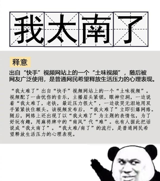 南是一个同音词,它指的是困难的“难”。因其非常轻松诙谐的调侃风格,以及可以用麻将中的“南风”来进行生动的图文表达,从而在网友间广泛流传。