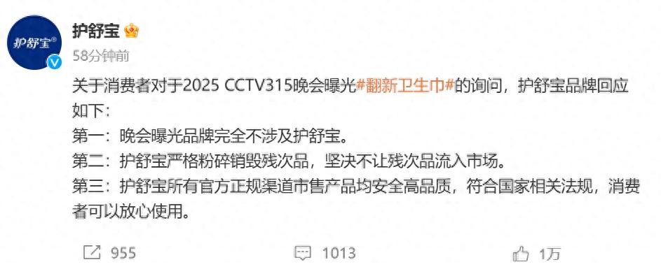 比如护舒宝就跳出来称,晚会曝光的问题品牌跟他们没啥关系,他们一直把残次品销毁得好好的,官方渠道的产品绝对安全放心。