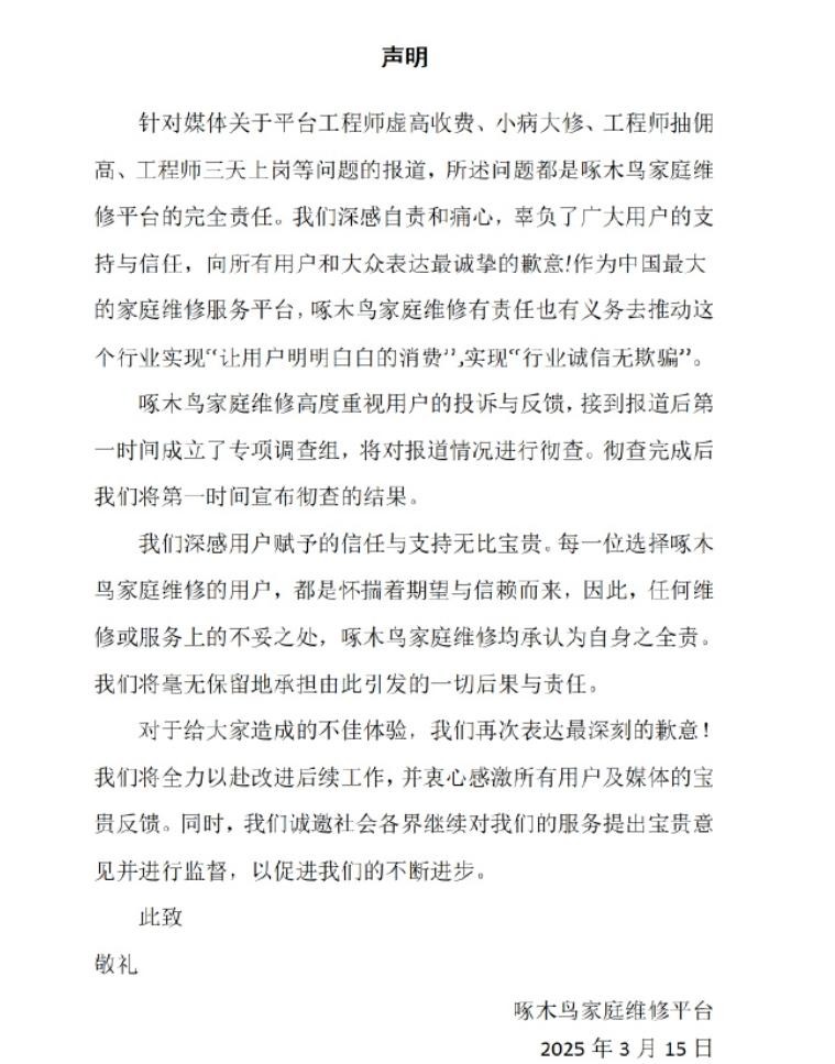 还有维修行业乱象也令人触目惊心,啄木鸟家庭维修被讽刺为“无病乱修、小病大修”,来坑蒙拐骗消费者,员工素质低下。