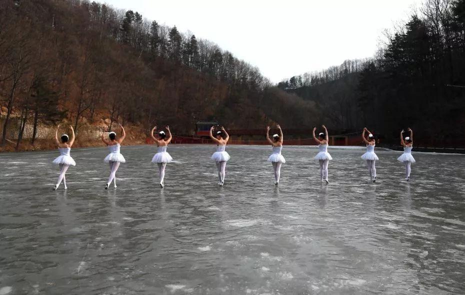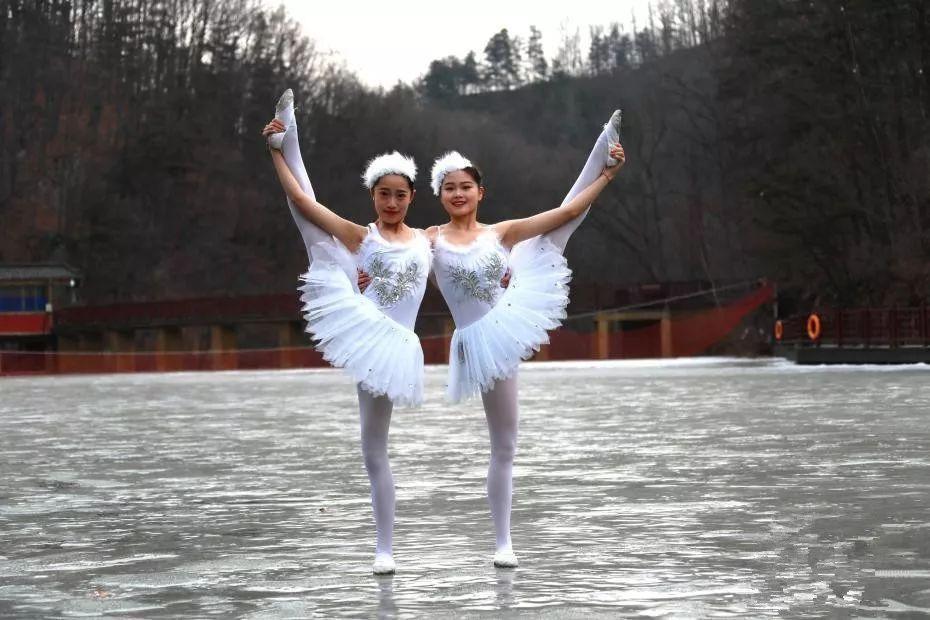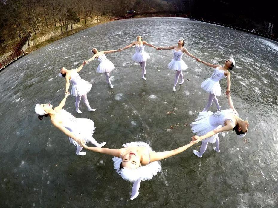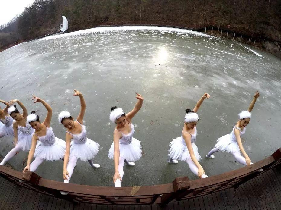 近日,河南嵩县白云山,连日低温天气致海拔1700米的白云湖大面积结冰,8名舞者在冰面上跳起了芭蕾。伴随着音乐的旋律,她们在冰面上竖起脚尖翩翩起舞,旋转、跳跃,灵动优美,恰似一群精灵落入凡间。