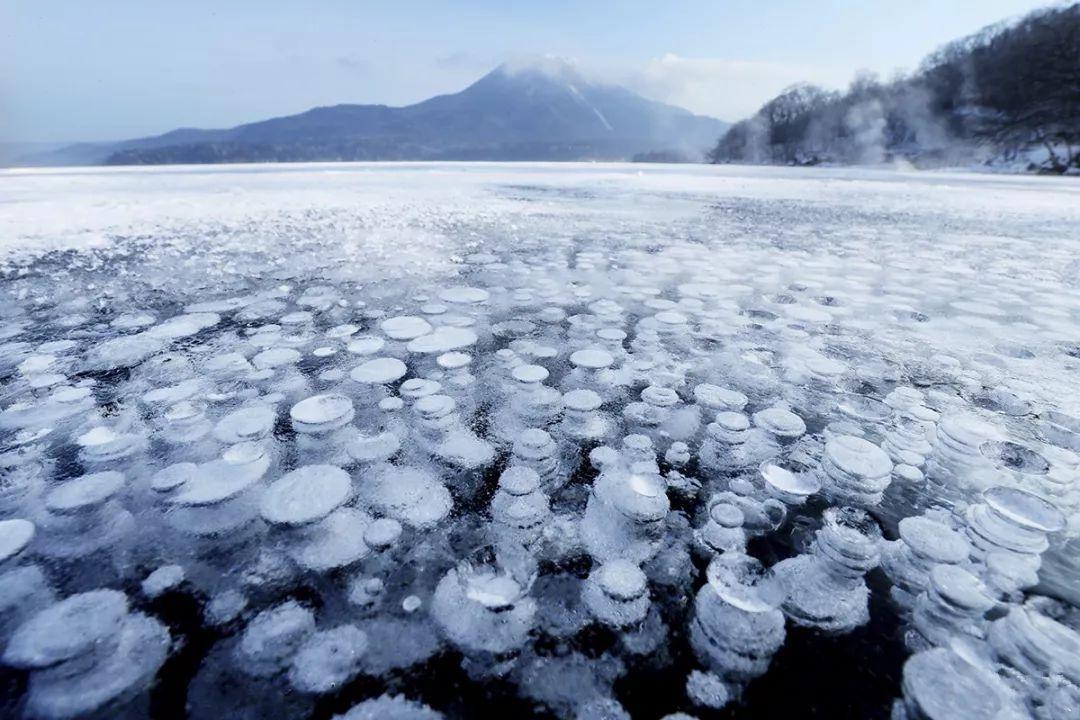 当地时间2017年12月24日,在日本北海道的阿寒湖现“冰冻气泡”奇景,唯美壮观令人叹为观止。冰冻气泡由湖底植物释放的甲烷在靠近湖面过程中冻结形成。
