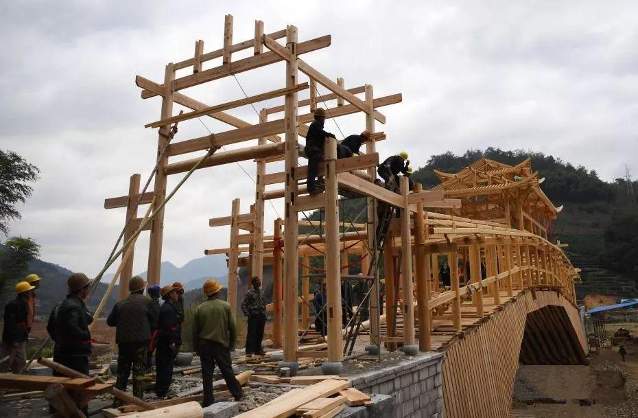 这组图片展示的是近期正在建设中的全国单孔跨度最大的木拱廊桥。据了解,这座廊桥位于福建省政和县外屯乡湖屯村,采取传统木拱建造样式,廊桥长56米、拱跨43.6米,跨度中国第一。廊桥仅桥拱部分就用350根圆木,其中十六、七米长的大杉木就用45根。据悉,木拱廊桥,也称虹桥,木构建拱,桥上盖顶为廊,是中国传统木构桥中技术含量最高的一类结构形式,也是世界桥梁史上绝无仅有的一个品类,常建于山区河床较宽、水深流急之处。2009年,中国木拱桥传统营造技艺被列入联合国《急需保护的非物质文化遗产名录》。