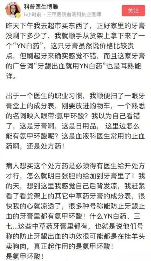 10月21日,一名身份认证为“三甲医院血液科执业医师”的自媒体账号@科普医生博雅 发文称,在一个知名的中草药牙膏(云南白药)成分中发现了氨甲环酸,而这是血液科医生常用的止血药,并且还是处方药。令其震惊的是,她发现超市货架上号称能防止牙龈止血的其他中草药牙膏的成分表中也有氨甲环酸,包括三七等。随后这个帖子在网络上引起热议。