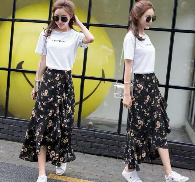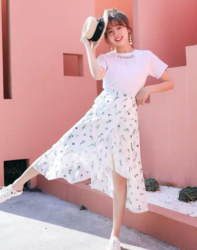 这碎花半身裙是一条+时尚的领带设计,这条裙子的设计让你的腿显得苗条修长,采用雪纺面料,非常舒适清新,搭配白色T恤,让你看起来很苗条和年轻,同时也很优雅和甜美,穿着很有知性气质,看起来使你显得年龄又小又清新。搭配二:鱼尾A字裹裙长裙+白色图案T恤