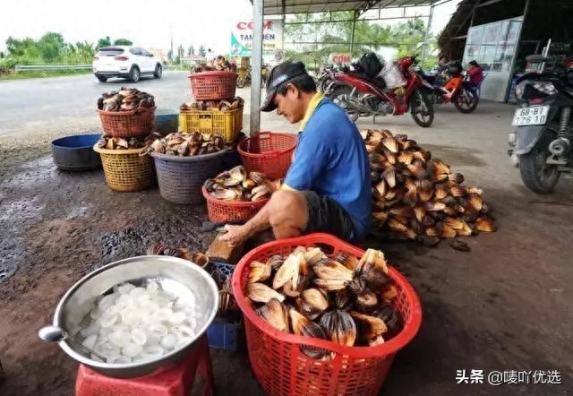 但越南南部水椰子很多,人们采来果实,将坚硬的外壳砍开,再将里面的果肉一个个挖出来。越南人做小吃很简单,稍微打碎,加上一些蔗糖和冰块,每个卖10千越南盾,合人民币3元钱。食用口感不错,加了冰块凉爽又略脆,又有种清香的味道。