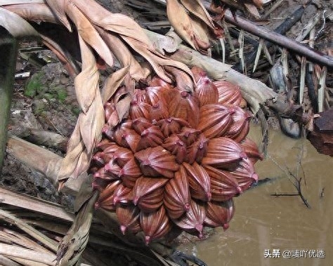 水椰子顾名思义,是长在水里的,果实接在根部上方露出水面。它的样子看起来像是一个立体的球,在它的上面有大概30多颗小瓣。小妖在网上查了一下,这种水果是叫“水椰子”也叫“亚答籽”,主要生长在亚洲的东部和南部还有澳大利亚、所罗门群岛等一些热带地区。