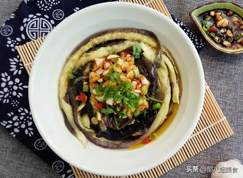 最后将料汁浇在茄子表面,再放入香菜碎或者新鲜葱花,这道菜就做好了,夏天必备的一道菜,好吃不腻,十分美味。