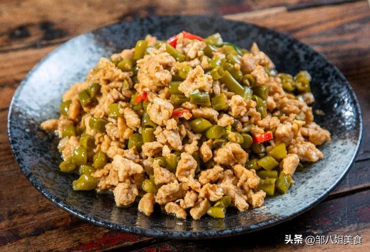 酸豆角清洗两遍,再切成碎丁状,装进盘内待用。五花肉冲洗一下,去掉外皮,剁成肉末。