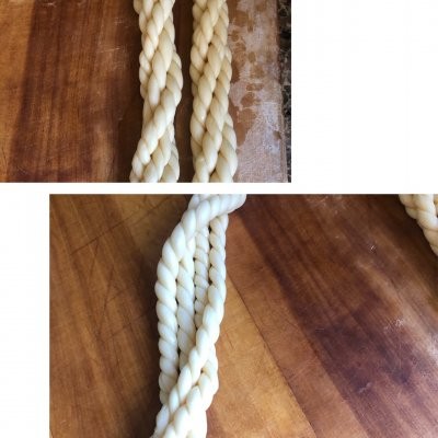 8、同样方法再卷一根,两个卷捏紧在一起。