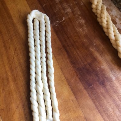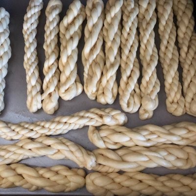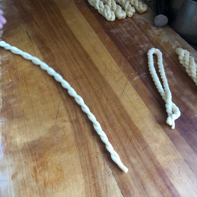 9、再顺着卷的方向,卷一卷,就成麻花卷了。