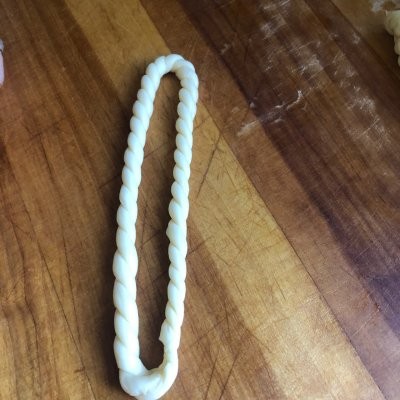 7、将两头掐紧,形成一个圆形的麻花卷儿。