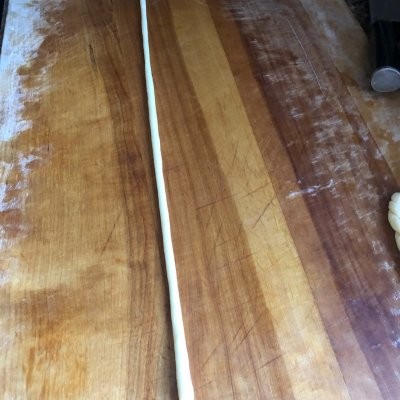 6、右手拿着右边的面头向下搓,左手拿着左边的面头扔到右手边,也向下搓。右手和左手不断交替,卷成一个长长的卷。