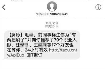 我10日下午收到一条短信,内容是:“×××,浙江××公司有前同事标注你工作'有两把刷子',并向你介绍了29个职业人脉,×××、×××、×××、×××等17个好友也在等着你。”短信最后的署名是“脉脉”。