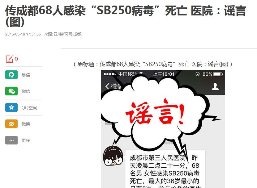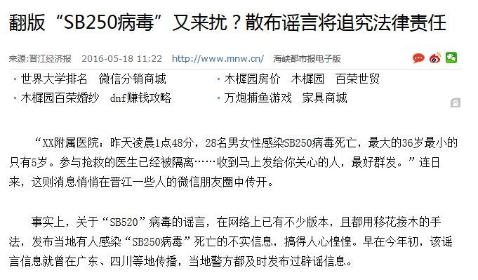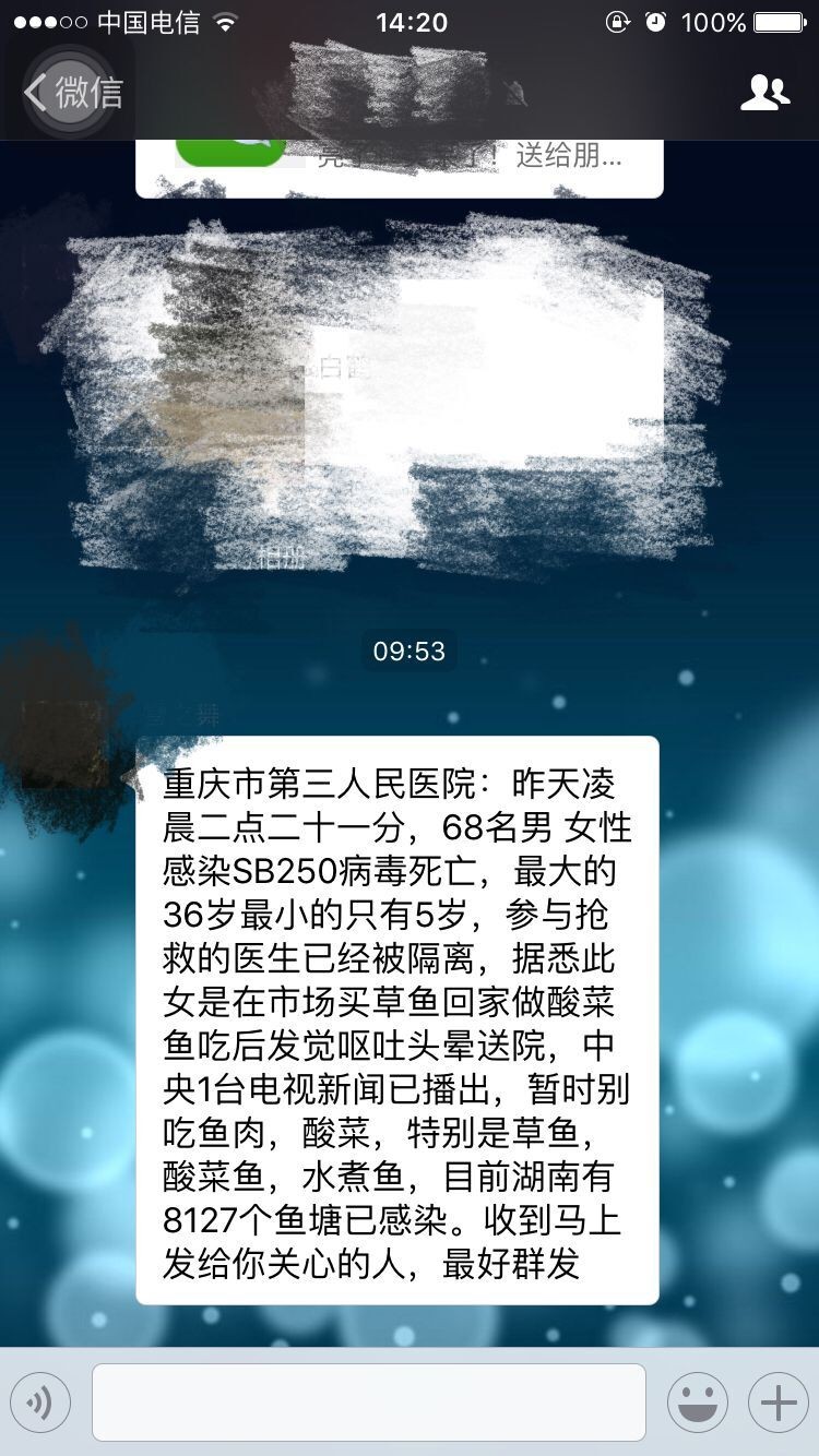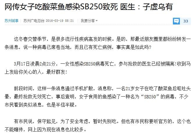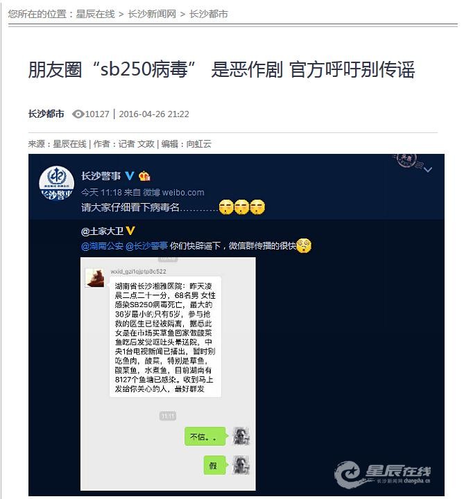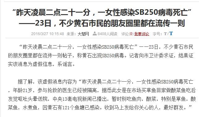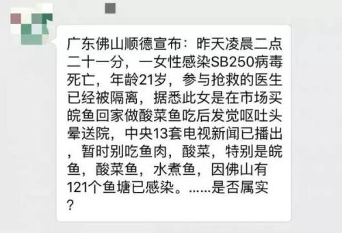 大致内容是:昨天凌晨,在XX市第三人民医院有68人感染SB250病毒死亡,原因是这些人吃了酸菜鱼,同时,参与抢救的医生已经被隔离。并称中央一台电视新闻已播出,告诫大家别吃鱼肉、酸菜,目前湖南有XX个鱼塘已感染。结尾说到:收到马上发给你关心的人,最好群发。