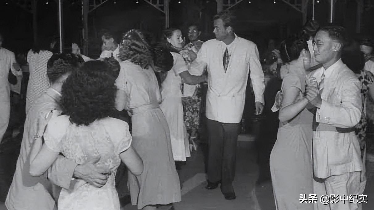这些贵妇名媛在美国士兵的邀请下在舞池中翩然起舞,端着名贵的香槟酒与美国士兵言笑晏晏。