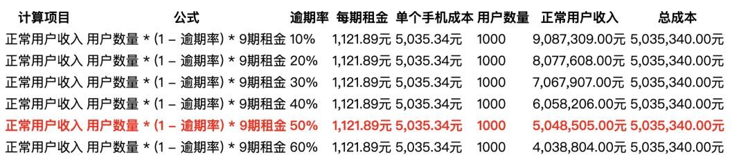 综上所述,手机租赁项目的核心在于实际成本和打出复利。在计算利润时,需要考虑到预收租金和剩余应收总租金,以及店内增值服务费用。根据逾期率的不同,可以计算出亏损临界点。