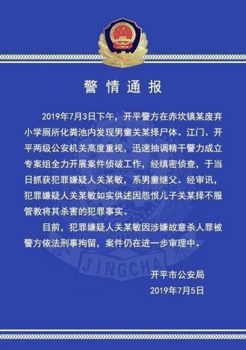 7月3日,据广东省江门市开平市公安局官方微博“广东开平公安”发布警情通报,7月3日下午4时许,开平警方在赤坎镇某废弃小学的厕所化粪池里发现一具男童尸体。江门、开平两级公安机关高度重视,迅速抽调精干警力成立专案组全力开展案件侦破工作,经缜密侦查,于当日抓获犯罪嫌疑人关某敏,系男童继父。