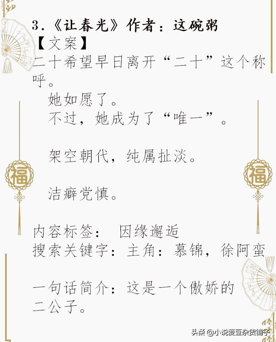 《让春光》是铺子前几天开始看的,还没有看完。男主有很多很多妾,还各自标了号码,女主就是“二十”。女主就是那种不争不抢,淡泊的性格,只想着什么时候男主厌倦她了,放她出府。这篇小说还会涉及一些斗争啊什么的,还挺刺激。后来男主女主经历了很多,大猪蹄子终于知道自己要啥了,男主也为女主放弃了很多,结局he。